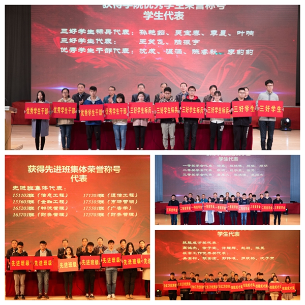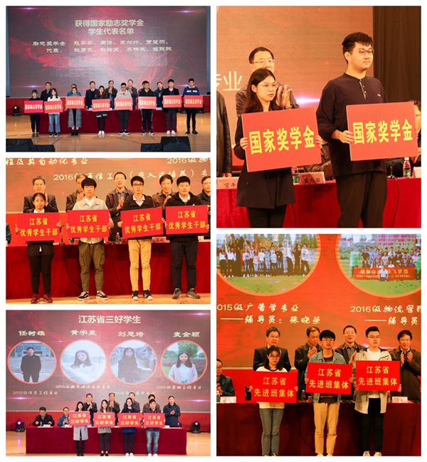 大会在庄严的国歌声中拉开帷幕。院党委书记戴兆骏宣读了《关于表彰2017/2018学年国家奖学金、国家励志奖学金获奖学生的决定》、常务副院长周西峰宣读了《关于表彰2018年江苏省三好学生、优秀学生干部和先进班集体的决定》、副院长包刚宣读了《关于表彰2017/2018学年优秀学生的决定》、副院长盛大铨宣读了《关于颁发2017/2018学年学生奖学金的决定》、党委副书记王立辉宣读了《关于表彰2017/2018学年先进班级的决定》。主席台领导为各类获奖学生代表颁发了荣誉证书。本学年,威尼斯官网共评出国家奖学金2人、国家励志奖学金138人、江苏省三好学生4人、江苏省优秀学生干部4人、江苏省先进班集体3个、院三好学生标兵54人、三好学生368人、优秀学生干部203人、一等奖222人、二等奖716人、三等奖925人、技能成才奖75人、社会工作优秀奖228人、第二课堂活动优秀奖8人、学习进步奖1439人、帮扶之星奖209人、院先进班集体10个。