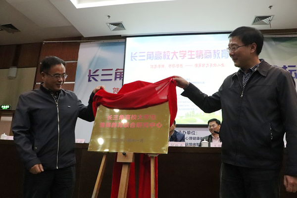 上海高校心理咨询协会理事长陈增堂代表长三角专业咨询机构对论坛的召开表示祝贺。他从学校健康教育的实践出发阐释了大学生情商教育的意义和目标,并代表四地专业机构表示愿意共同致力于大学生情商素质提升的研究和实践。为加强资源整合,发挥示范带动作用,四地相关专业机构拟成立长三角高校大学生情商教育联合研究中心,浙江省高校心理健康教育研究会副理事长、高校心理咨询专业委员会副主任委员王晓刚和江苏省心理学会大学生心理专业委员会副主任戴兆骏共同为“长三角高校大学生情商教育联合研究中心”揭牌。