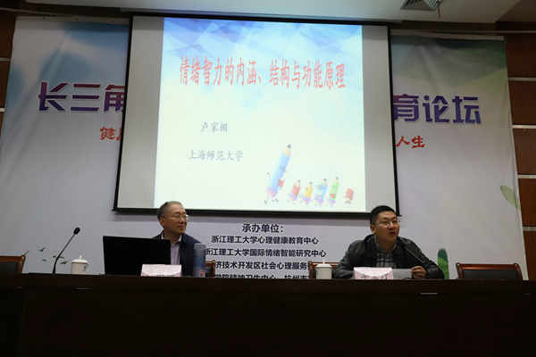 开幕式后,论坛举行了专家报告和交流研讨。国家“万人计划”教学名师、国内情商教育研究资深专家卢家楣教授和中国心理卫生协会大学生心理咨询专业委员会副主任、上海高校心理咨询协会专家委员会主任黄晞建教授分别作了题为《情绪智力的内涵、结构和功能》和《思想政治心理学中的情商修养》的报告。“青年情感素质提升”圆桌论坛上,同济大学、江苏大学、杭州电子科技大学等8所高校的心理健康教育中心主任以及有关政府、医院代表分别从学校育人体系设计、课程教学、心理咨询、社会心理服务体系支持等视角,对高校心理育人及情商教育工作展开了研讨。