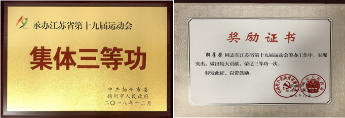近日,中共扬州市委、扬州市人民政府联合下发了《关于对扬州市在江苏省第十九届运动会组织运行和备战参赛工作中表现突出的先进集体及先进个人予以表扬奖励的通报》(扬委〔2018〕260号),威尼斯官网荣获承办江苏省第十九届运动会集体三等功,解厚荣同志荣获个人三等功。