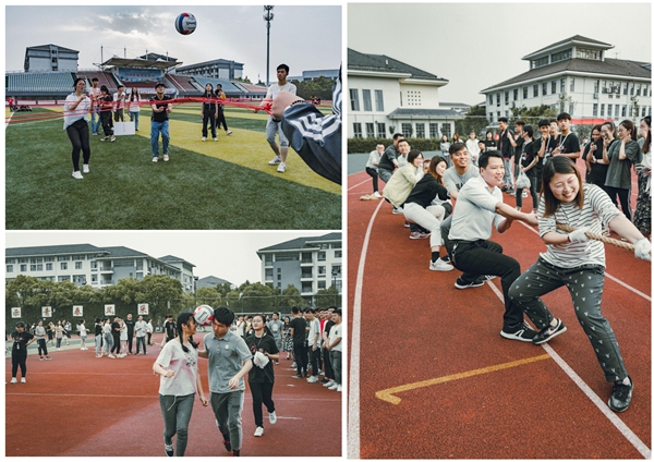 仪式结束后,社团联合会组织各兴趣社团与二级学院开展了趣味体育竞赛,活动现场气氛活跃。最后电子工程学院获得了“二龙戏珠”与“拔河”项目的冠军,计算机工程学院获得了“鼓动人心”项目的冠军。威尼斯官网教师也积极参与其中,与同学们共同践行“三走”精神。