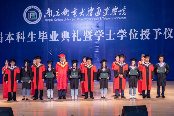 学院领导为毕业生拨流苏,颁发学位证书,并与毕业生们合影留念