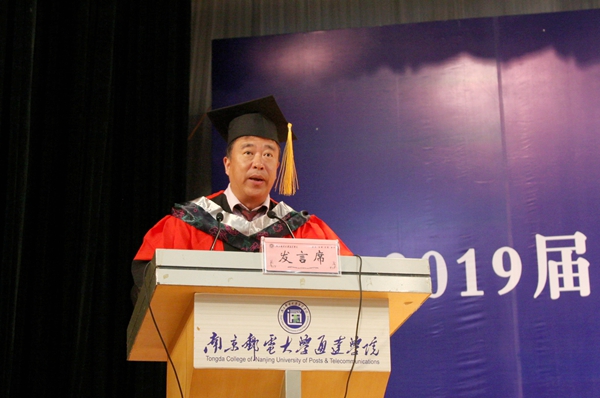 学院院长王承宽在致辞中向学院2019届毕业生表示最热烈的祝贺,对同学们在校期间取得的优异成绩给予充分肯定,他对毕业生们提出了三点要求:一是要做到通道达理,做一个信念坚定的人,在奋进中把握机遇,在历练中成长成才;二是要做到通理达情,做一个温暖社会的人,温暖他人、温暖自己;三是要做到通情达成,做一个有担当有作为的人,不忘初心,为实现中国梦建功立业。