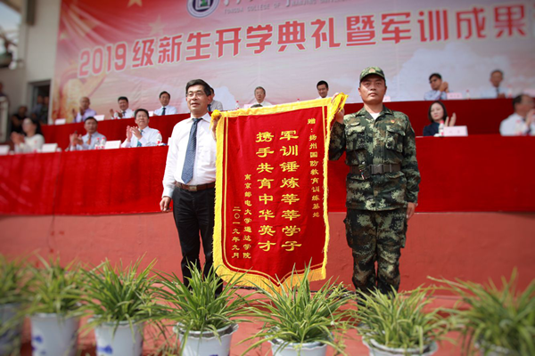 军训汇报演出后,学院党委副书记兼副院长王立辉宣读了学院对8个优秀连队和132名优秀军训标兵的表彰决定。学院院长王承宽代表学院向扬州国防教育训练基地的承训教官赠送“军训锤炼莘莘学子,携手共育中华英才”的锦旗,感谢承训教官对学院国防教育工作的大力支持。