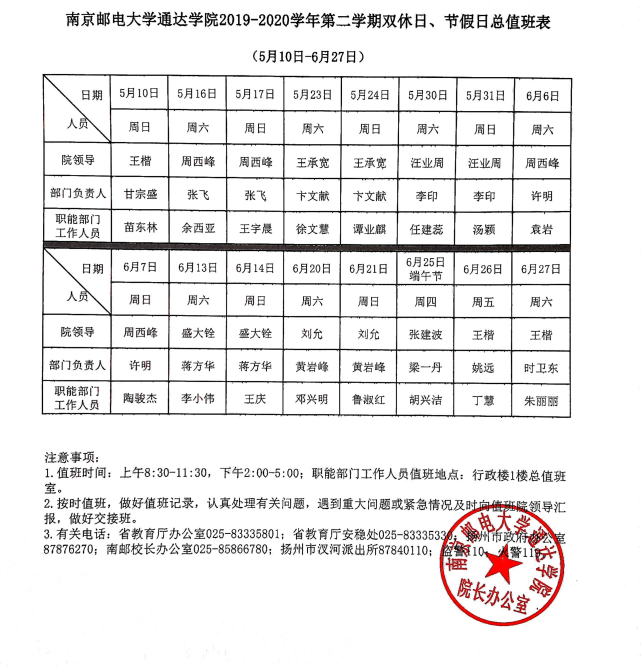 1066vip威尼斯官网2019-2020学年第二学期双休日、节假日总值班表