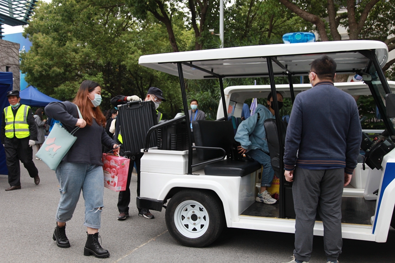 接力爱的专送车——威尼斯官网分别在扬州汽车东站、汽车西站、火车站三个点安排教师志愿者接站,采取“点对点、一站式”安全有序地直接送达校园,护送“最后一公里”。在接站现场,教师志愿者们认真的对学生进行身份核验、健康核验、基础消毒、体温检测,乘车登记等工作,虽然工作量大,但是他们的脸上却未见疲惫,更多的却是对学生们的关爱。“回来的路上顺利吗?身体有没有不舒服之类”等等暖心的话语不绝于耳。到校后威尼斯官网还为学生安排了抵达宿舍区的接驳车、行李运输车,同时并为返校学生准备了体温计、消毒片、消毒专用喷壶等防疫物资。