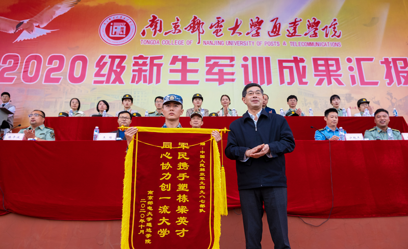 军训汇报演出后,学院副院长倪可宣读了学院对5个优秀表演方队、15个优秀军训连队和78名优秀军训标兵的表彰决定。中国人民解放军东部战区沙艳杰营长作了军训总结讲话,他首先肯定了同学们和军训教官的军训成绩,同时也提出了新的要求,他希望同学们把军训中学到的不怕苦不怕累的作风带到学习和生活中,不要轻易放弃,努力学习专业知识,将来报效祖国。学院院长王承宽代表学院向中国人民解放军东部战区94987部队的承训教官赠送“军民携手塑栋梁英才,同心协力创一流大学”的锦旗,感谢承训教官对学院国防教育工作的大力支持。