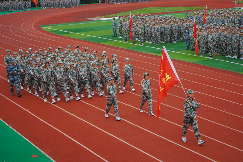 近2500新生列着整齐的队伍,在教官的带领下,以嘹亮的口号、严密的纪律、过硬的素质接受主席台领导和老师的检阅。伴随着雄伟的乐曲,5个营39个军训方队依次经过主席台前,步伐坚定、队形整齐、气宇轩昂,彰显着属于他们千禧年的青年人的青春与朝气。从2500名大一学生中组织了120人的军训队列方队进行集中展示,同学们的动作整齐划一,得到在场师生的阵阵掌声,受训学生展示了防身格斗术、应急棍术、军体拳、步兵战术演练表演。整齐划一的动作,刚劲有力的踢脚勾拳,娴熟连贯的军体动作,变换万千的花样队列,男生尽显铮铮铁骨,女生尽展英姿飒爽,他们的精彩表演深深感染了在场的每一个人。