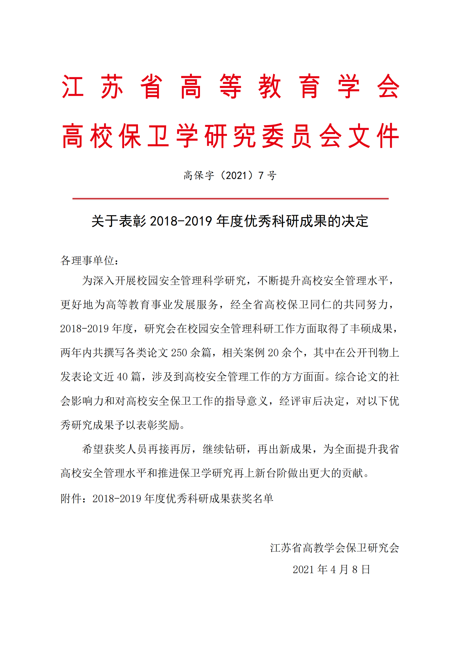 近日,江苏省高等教育学会高校保卫学研究委员会发文《关于表彰2018-2019年度优秀科研成果的决定》(高保字[2021]7号),威尼斯官网保卫处陈平波同志发表的《新时期大学生安全教育与改进对策—以江苏独立学院为例》论文荣获科研成果三等奖 。