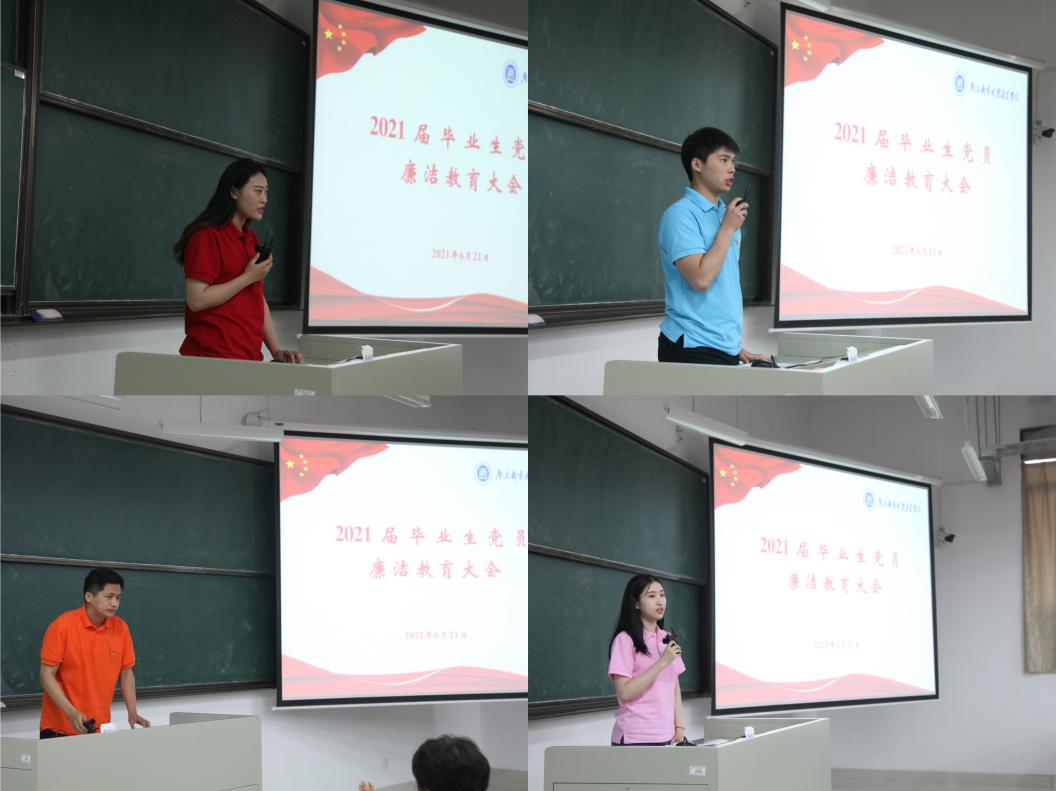 通信工程专业吕蕾、自动化专业袁必康、物联网工程专业吴轶杰及财务管理专业丁佳璐作为毕业生党员代表分享了自己作为党员四年来的学习收获以及对共产党员廉洁自律的体悟。他们认为,保持廉洁自律就要:加强理论学习,强化思想武装;勇于直面问题,敢于担当责任;严格克己自律,发挥模范作用;用好手中权,管好身边人。随后,学生工作处副处长余西亚,团委社团管理部部长刘甜甜向毕业生党员代表赠送廉洁教育读本。