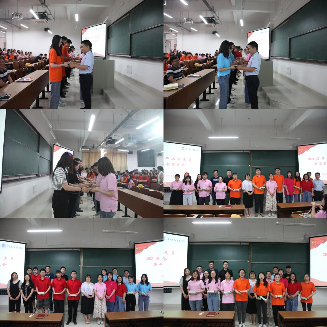 纪委办公室主任卞文献宣读毕业生廉洁寄语,她勉励大家要崇廉尚洁,明纪守法,做严于律己的规矩人;要从善求美,明辨笃行,做身清气正的奋斗者;要勤勉务实,求真力行,做锐意进取的实干家;要坚定信仰,志存高远,做勇担重任的追梦人。