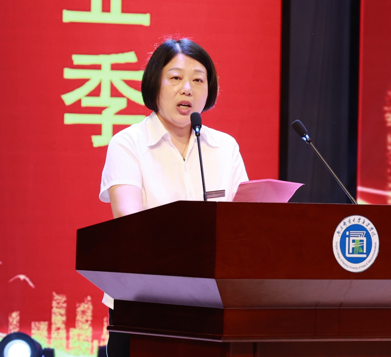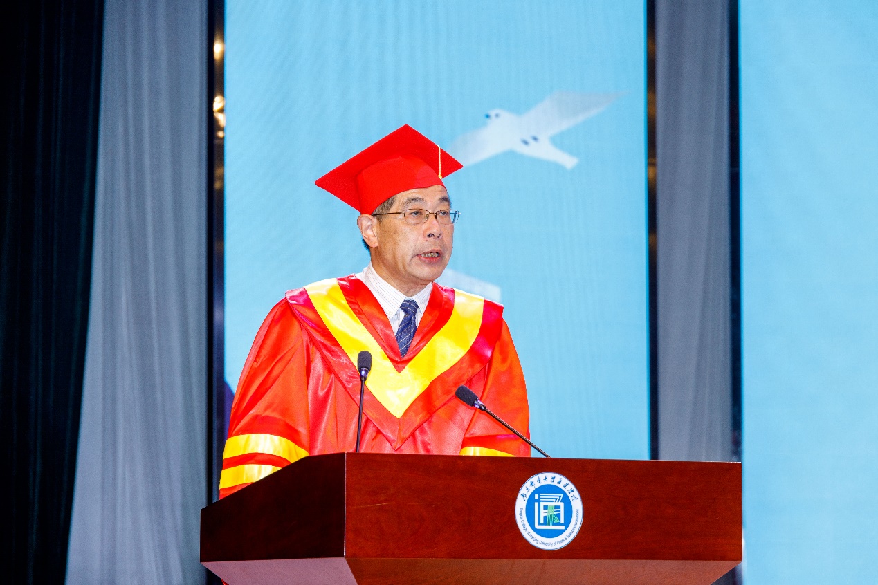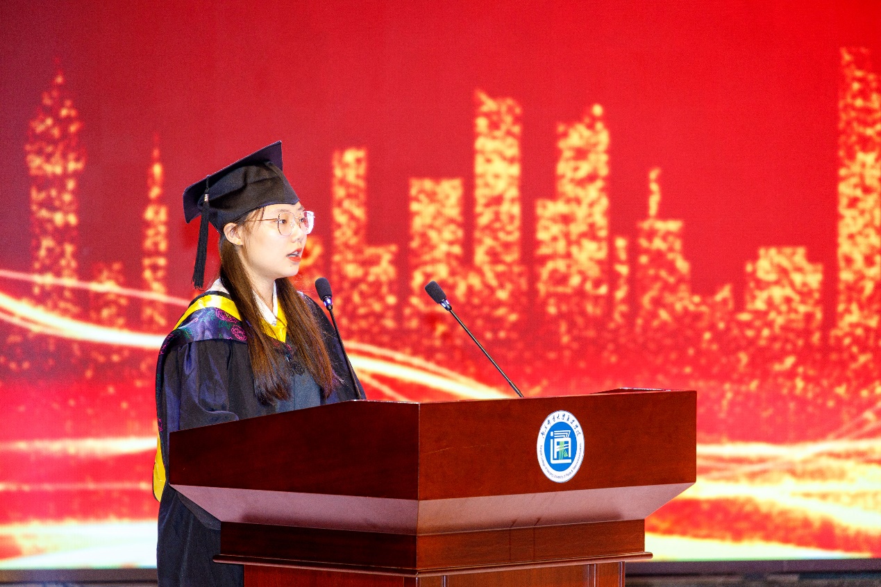 毕业典礼上,教师代表余永红、宿舍管理员代表翁秀芬、家长代表陆洪良、全体毕业班辅导员分别给毕业生们送上了诚挚祝福,勉励毕业生们在未来的新征程上,不负韶华,让青春在努力奋斗中绽放异彩,一路风景,一生芳华。毕业生代表陈睿秋同学回顾了四年大学生活,感念师恩,感恩母校,希望与同学们一起继续奋斗,成为母校和家长的骄傲与荣光。
