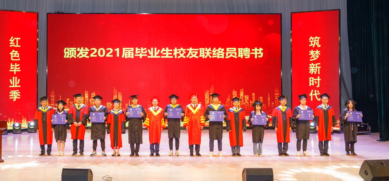 学院副院长刘允老师宣读优秀毕业生表彰决定和校友联络员聘请决定。典礼上,荆校长和全体院领导为2021届优秀毕业生代表颁发荣誉证书,为2021届校友联络员代表颁发聘书。