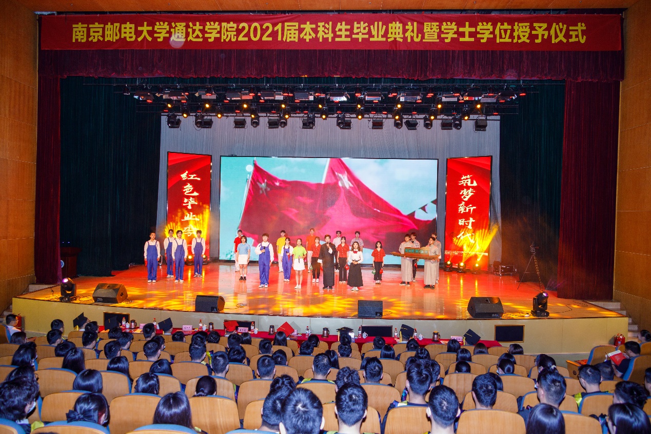 毕业典礼开始前,诗朗诵《红旗下的青春》让大家重温了党的百年历史,回顾了党带领全国各族人民从南湖红船出发,到成立中华人民共和国,从改革开放到中国特色社会主义迈进新时代砥砺奋进的光辉历程,展现了党为人民谋福祉,为民族谋复兴的初心使命。
