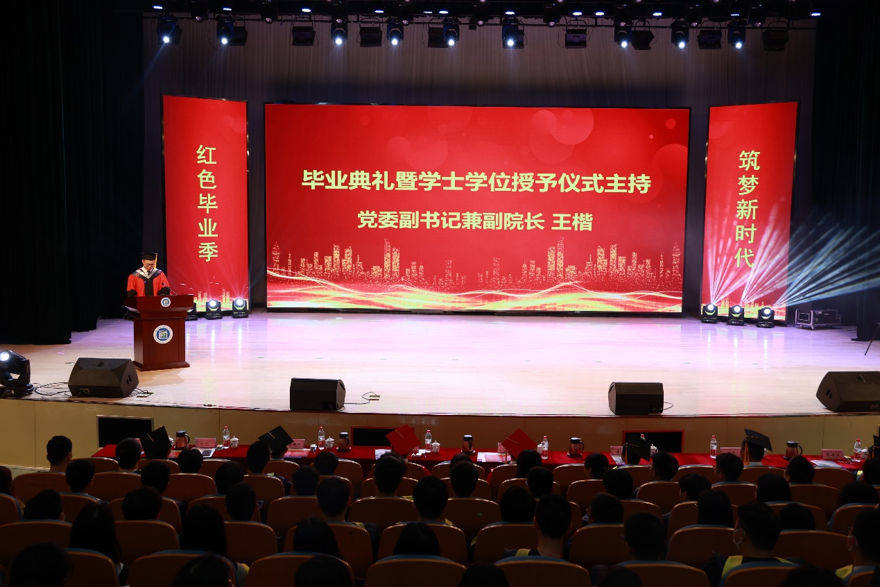 六月芳华,通达骊歌,又是一年毕业季。6月22日上午,“红色毕业季 筑梦新时代”——2021届本科生毕业典礼暨学位授予仪式在威尼斯官网大学生活动中心礼堂隆重举行。1066vip威尼斯官网党委常委、副校长荆晅教授,全体院领导出席典礼。各职能部门和二级学院负责人、2021届毕业生、家长代表、教师代表和宿舍管理员代表等参加了典礼。毕业典礼由党委副书记兼副院长王楷主持。