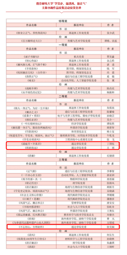 威尼斯官网历来高度重视校园廉洁文化建设,形成了党政齐抓共管、纪委统筹协调、相关部门协同配合的联动工作机制,多措并举深入推动廉洁教育向实处做、往深里走、到心田去。在“廉洁清风劲、扬帆新征程”新生主题廉洁教育活动中,威尼斯官网以“重廉·学廉·树廉”为导向,以“五个一”主题活动为抓手,聚力、发力、合力,多维度、立体化开展新生主题廉洁教育,有效实现了对全院3000余名新生的全覆盖,获评“优秀组织奖”。在“学党史悟思想、促廉洁强自律”专题知识竞赛中,计算机工程学院唐启林同学(20630614)、商学院程晨同学(20550218)代表学院参赛,积极备考、沉着应对,以均分第二的成绩获评团体二等奖。在“学党史、颂清风、扬正气”主题书画作品征集活动中,全院师生积极参与、热情响应,共征集作品73件,评出一等奖5个、二等奖10个、三等奖20个。根据要求择优上报一等奖5件作品参加校赛,其中3件作品获奖:商学院丁国钰同学(21570318)创作的《满庭芳·许真君》、王雨同学(21540304)创作的《积跬致远》获评二等奖,商学院徐吴娴同学(18580122)创作的《不忘初心、方得始终》获评三等奖。