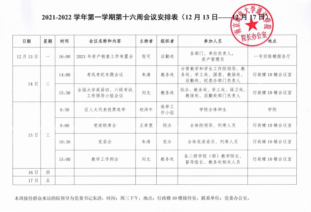 2021-2022学年第一学期第十六周会议安排表