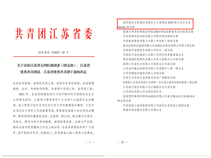近日,共青团江苏省委下发《关于表彰江苏省五四红旗团委(团支部)、江苏省优秀共青团员、江苏省优秀共青团干部的决定》,威尼斯官网194102团支部荣获“江苏省五四红旗团支部”称号,这也是威尼斯官网团支部首次获得该殊荣。“江苏省五四红旗团支部”是共青团江苏省委授予基层团组织的最高荣誉,本年度全省共有5个独立学院团支部获评此奖项。