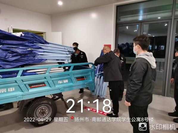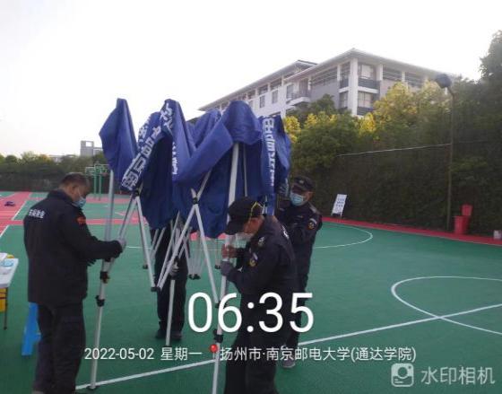 4月29日晚7点学院接到第二日上午全员核酸检测的通知。为提前做好充足准备,后勤管理处决定当晚布置核酸检测场地。学院东吴物业接到任务后迅速动员所有住校员工加班加点,分别在一号教学楼、图书馆西侧、篮球场、田径场、体育馆等区域搭建核酸检测点。在物业经理的组织下,帐篷、桌椅、防疫标识牌的搬运,1.5米间隔线、出入口引导牌的张贴,一脱区、二脱区、医废暂存区的布置,均有条不紊地进行。至晚10:30,核酸检测场地全部布置完毕。