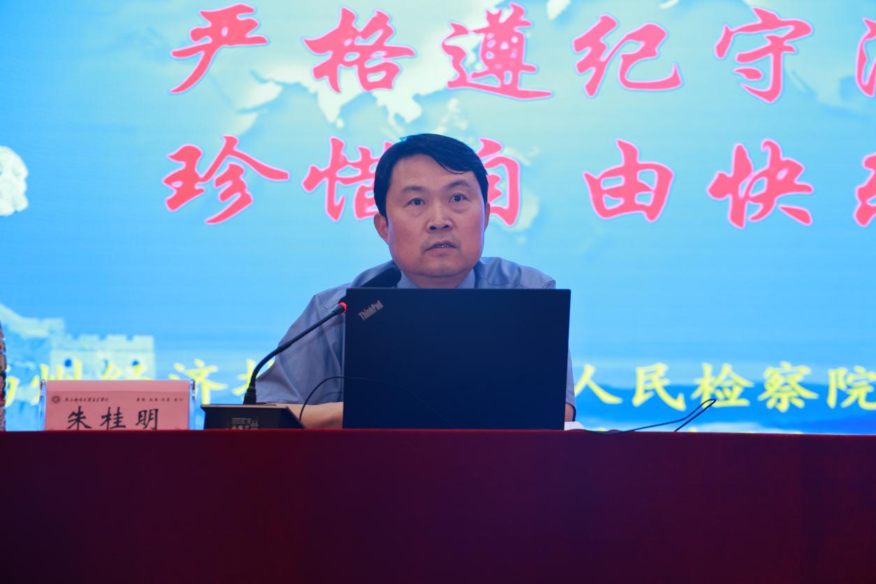 会议邀请到扬州经济技术开发区人民检察院党组成员、副检察长,四级高级检察官朱桂明同志作《严格遵纪守法 珍惜自由快乐》专题辅导报告。会上,朱检察长从近三年刑事犯罪的基本状况谈起,结合身边具体事例、深刻教训,以案释法、以法论事,向与会人员解读了相关违反纪律和违法犯罪行为,并分析了违纪违法行为产生的思想原因、制度原因、监管原因和社会原因。朱检察长指出,党员干部要把“自由、健康、快乐”6个字牢记于心,一要严格自律,加强对法律法规和党纪条规的学习,认真践行“三严三实”,时刻做到警钟长鸣,算好“自由账”“健康账”“快乐账”;二要强化他律,加强对党员干部廉洁自律和法律的宣传教育力度,建立健全制度机制,做深做细做实监督工作,加大提醒惩戒力度,做到防微杜渐、防患于未然。