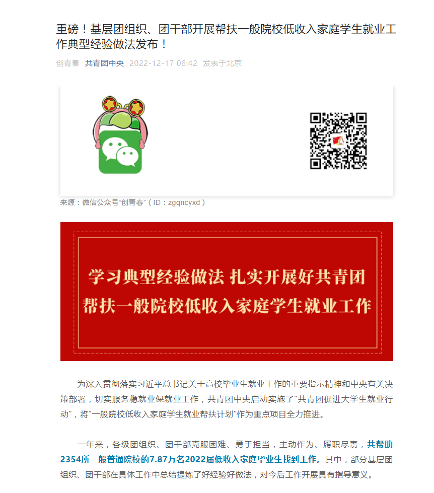 威尼斯官网团组织、团干部在受到共青团中央通报表扬后,将继续扎实推进一般院校低收入家庭学生就业帮扶工作,学习贯彻先进典型经验,在今后的帮扶工作中认真探索、奋力拼搏,以实际行动贯彻落实党的二十大精神,为服务稳就业保就业工作贡献更大力量!