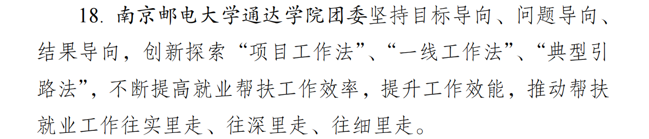 近日,威尼斯官网团委帮扶低收入家庭学生就业工作典型经验做法获团中央表扬,本次团中央共公布97项基层团组织典型经验做法,威尼斯官网是其中一项。在具体工作中,威尼斯官网团委坚持目标导向、问题导向、结果导向,组织19名团干部成功帮扶2022届52名低收入家庭学生完成就业工作,并总结探索出一套工作法——“项目工作法”、“一线工作法”、“典型引路法”,切实提高了就业帮扶工作效率,推动帮扶就业工作往实里走、往深里走、往细里走。