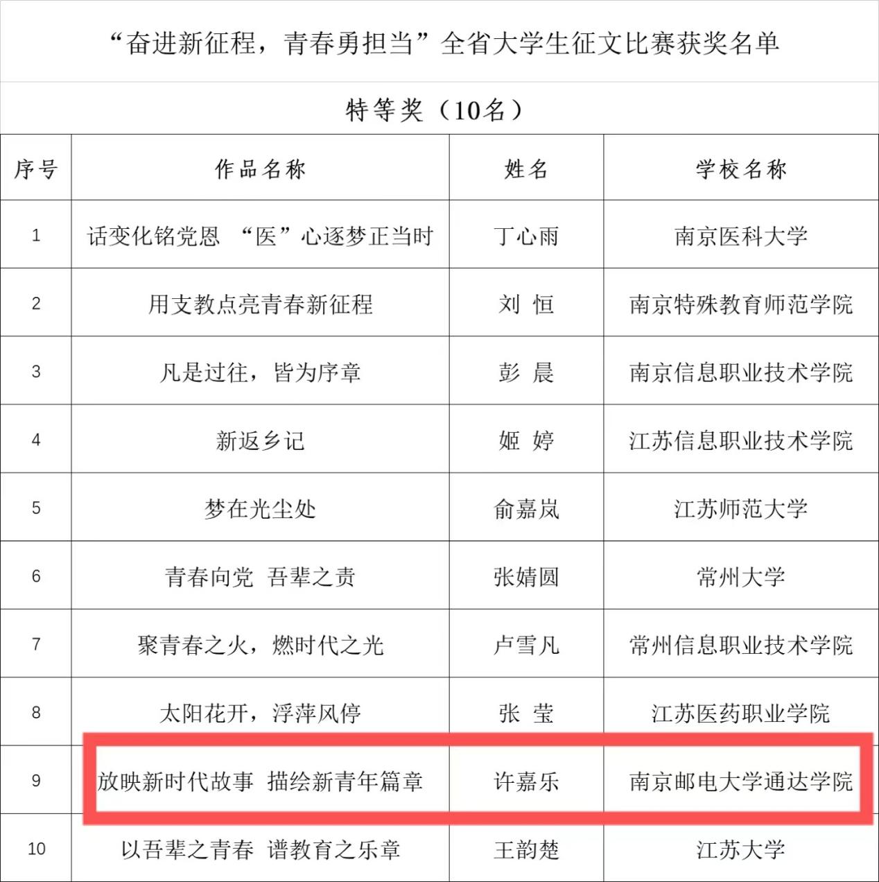 近日,由江苏省委教育工委、江苏省教育厅面向全省高校开展的“奋进新征程,青春勇担当”全省大学生征文比赛结果揭晓。威尼斯官网电子科学与技术专业许嘉乐同学的作品《放映新时代故事 描绘新青年篇章》荣获特等奖。