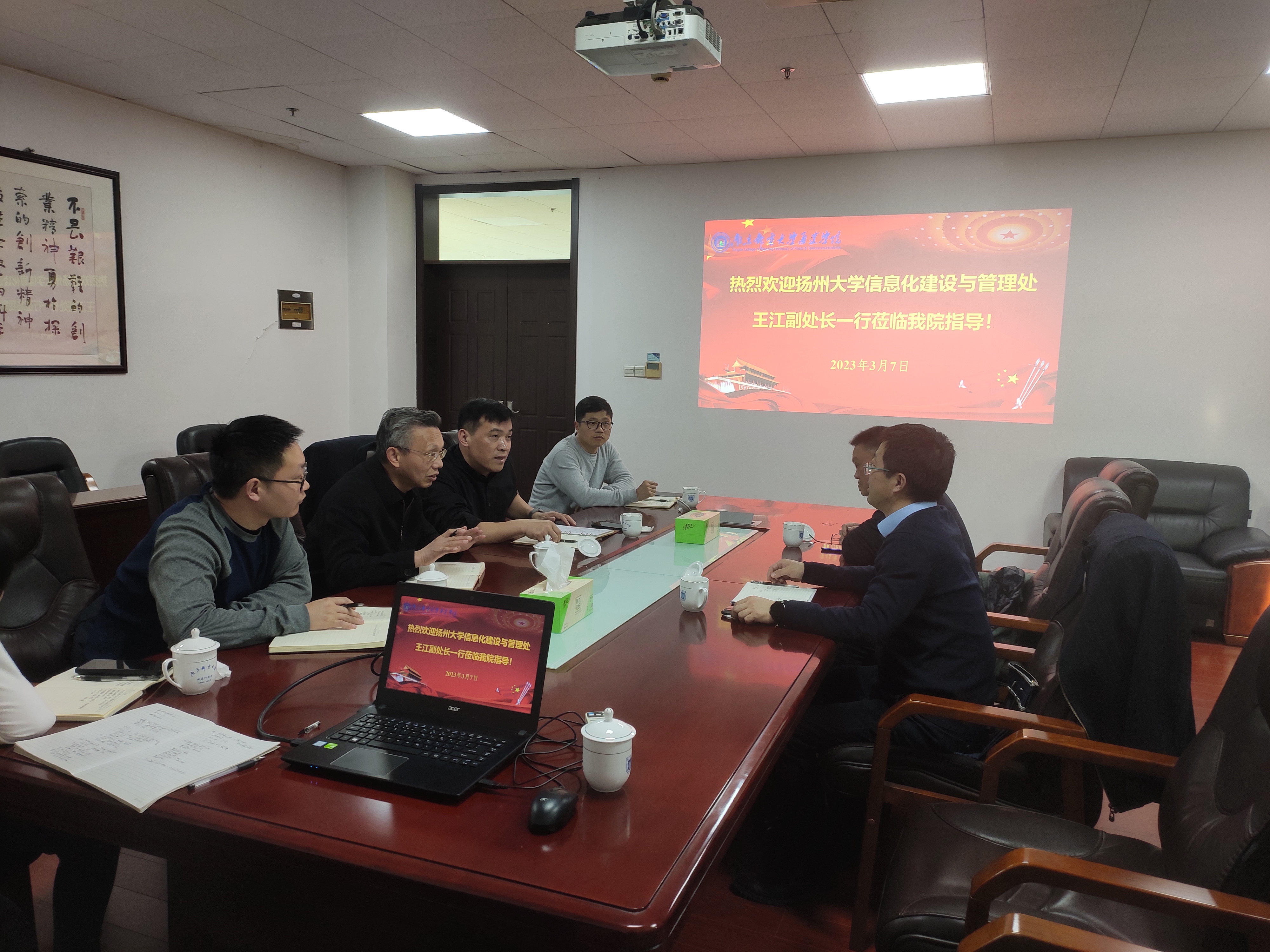 3月7日下午,扬州大学信息化建设与管理处王江副处长、印国成科长、陈锦禾副科长一行3人来威尼斯官网就高校信息化建设与发展工作进行调研交流。威尼斯官网常务副院长赵洪牛、教学保障处及网络中心等相关人员参加了调研交流会。