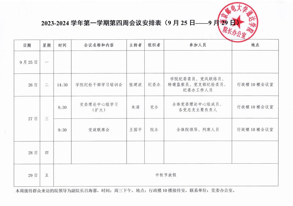 2023-2024学年第一学期第四周会议安排表